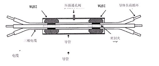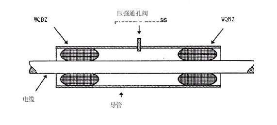 試驗設(shè)置:管道和電纜的類型和直徑按照安裝說明的要求選擇。電纜的長度根據(jù)所涉試驗實際情況進(jìn)行選擇。對于壓力保持性試驗,WQBZ樣品充滿空氣,保持連接在穩(wěn)定的氣壓源上。在WQBZ區(qū)域,管壁有密封膠。如下圖所示: