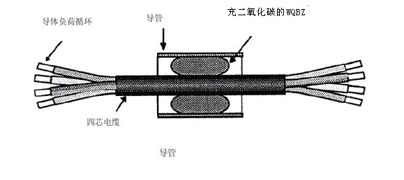 將8件WQBZ樣品安裝在短100毫米內(nèi)徑PVC導(dǎo)管,帶一根四芯XLPE絕緣的150平方毫米1KV鋁電纜。用壓強(qiáng)比大氣壓高200LPa的二氧化碳?xì)饨oWQBZ樣品充氣,使測量過程中真空壓強(qiáng)達(dá)到300KPa(3巴)。下圖顯示所采用的試驗配置原則: