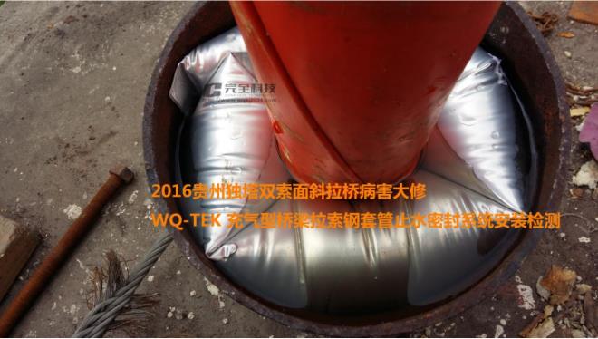 性能檢測(油料、酸堿液體),完全適用于橋梁斜拉索導管孔洞的防水密封。對比傳統的填充發泡膠或灌注防水油脂的防水密封方式,安裝密封氣囊具備兩個明顯的優勢: