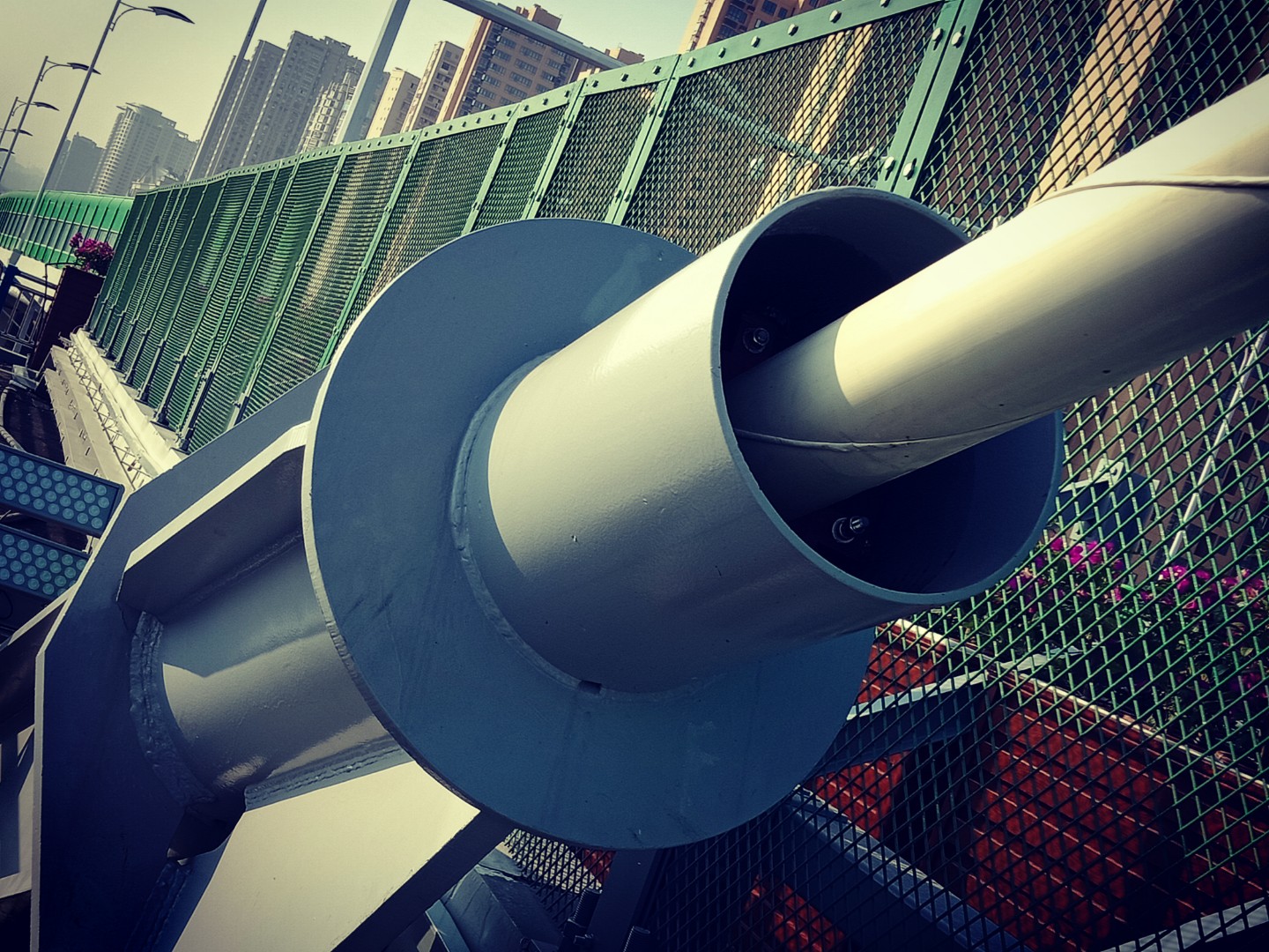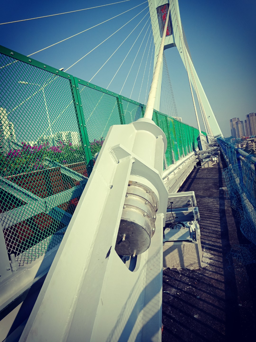 1、龍巖大橋?qū)儆谛陆蛄海行乃魉䞍蓚?cè)兩面各11根斜拉索,共計44根,對應(yīng)44個索導(dǎo)管孔。斜拉索及對應(yīng)索導(dǎo)管有6種規(guī)格,斜拉索外徑范圍103-137mm,索導(dǎo)管內(nèi)徑范圍257-331mm。索導(dǎo)管位置位于道路邊沿圍欄與大橋最外側(cè)圍欄之間,兩道圍欄之間寬度可供安裝施工人員站立和行走。