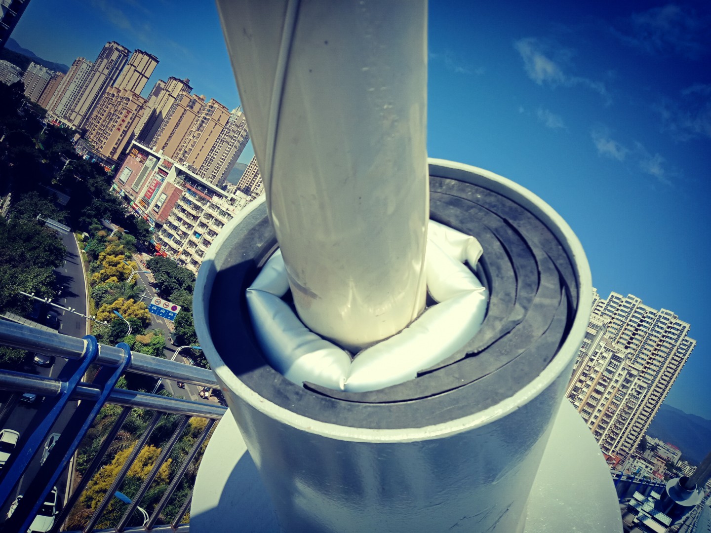 2、索導(dǎo)管內(nèi)置減震器正在安裝過程中,需要在安裝完減震器之后,才能在減震器上面部位安裝充氣型斜拉索導(dǎo)管密封系統(tǒng)。即減震器安裝時需要預(yù)留出上部25厘米的密封系統(tǒng)安裝距離。在安裝完密封系統(tǒng)后,再安裝防雨罩。因此,整個施工過程需要兩組人員配合進(jìn)行,一組人負(fù)責(zé)安裝減震器和防雨罩,另一組人負(fù)責(zé)安裝密封系統(tǒng)。