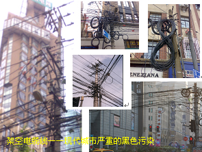 如此龐大、蛛網密布的城市架空線,造成很大程度上市容景觀遭“破壞”,也造成鱗次櫛比的傳統與現代的建筑立面被“損傷”,還限制了綠色樹木的長高,再加之小廣告、招貼單雜粘在電桿塔上,更有甚者把架空纜線當成了晾衣繩,不容置疑,這一切不但在惡化城市環境,恐怕更是對人們視覺的嚴重黑色污染。